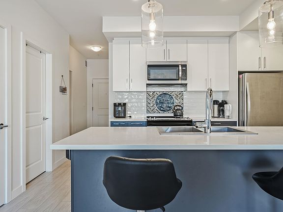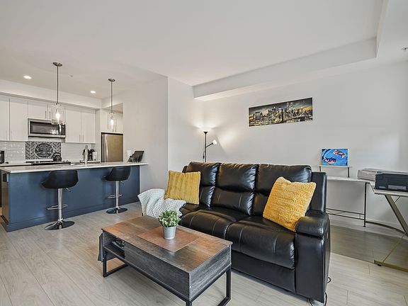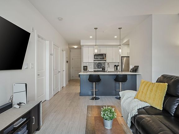 Modern open layoutQuartz countertopsSleek cabinetryStainless steel appliancesBreakfast barSpacious bedroomWalk-in closet