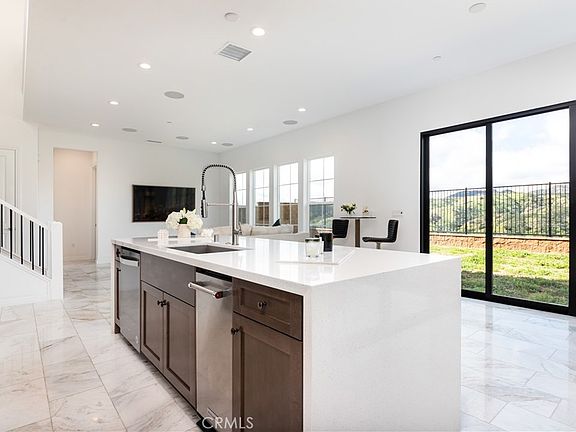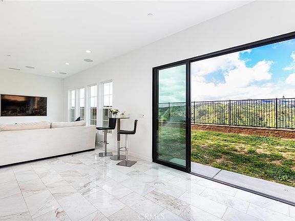 This deluxe two-level home is truly a gem on the BEAUTIFUL back-to-view lot in a gated community. This unique corner lot features the most private house in the entire community and offers an exclusive and breathtaking backyard and mountain view. A stunning modern design customized with a bespoke interior, luxury marble stone flooring on the entire first floor and charming European Oak engineered hardwood on the second floor and stairs along with four bedrooms, three bathrooms, and a two car garage for your convenience.This Toll Brothers' award-winning design has a welcoming covered porch and foyer that flow into a magnificent great room, lovely dining room, and spacious kitchen with revealing views of the mountains through modern multi-slide stacked doors and a luxury outdoor covered living space that includes a 42’’ courtyard fireplace and marble stone patio equipped with a speaker system and television pre-wiring for mounting a television. This fully upgraded contemporary home is made for entertaining with high-end home theater and surround sound speaker systems and television pre-wiring in the great room and the upstairs loft and plenty of additional LED recessed lights, J Boxes, and LED dimmers throughout the house. The well-equipped gourmet kitchen has an expansive waterfall center island and breakfast bar, upgraded cabinetry, pot filler, upgraded sink and faucet, and built-in stainless-steel appliances, including a built-in refrigerator/freezer, full range oven, microwave, trash compactor, and spacious pantry. The bright and beautiful high ceiling primary bedroom suite features a spacious walk-in closet, and deluxe primary bath with dual-sink vanity, large upgraded standing rain shower with seating, and luxe Italian marble highlights from the floor to the shower with stunning views. Other highlights include a convenient main floor bedroom/home office and full bathroom, OWEND solar panels to cut down energy costs. The home is located in a secure gated community within Porter Ranch that provides private resort-style amenities, including a recreation center with an Olympic-size pool. The home is near the top-rated K-8 Porter Ranch Community School that embraces a Korean Dual-Language Program (KDLP). The area also features hiking trails, nature reserves, and parks as part of the lifestyle of the Porter Ranch community. Additional shopping centers, delicious restaurants, and even the Malibu Wine Safari are all within proximity of this fantastic home.