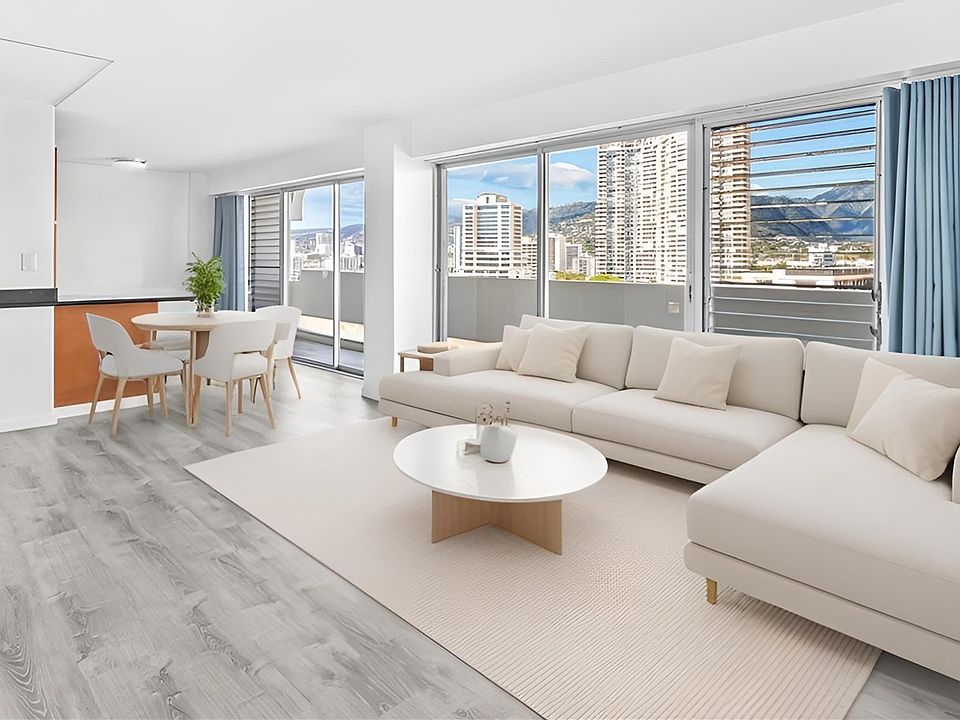 Beautifully renovated 2-bedroom, 1.5-bathroom unit offering 977 sq. ft. of interior living space plus an additional 108 sq. ft. of outdoor balcony with panoramic views of the Ala Wai, golf course, and Honolulu skyline.