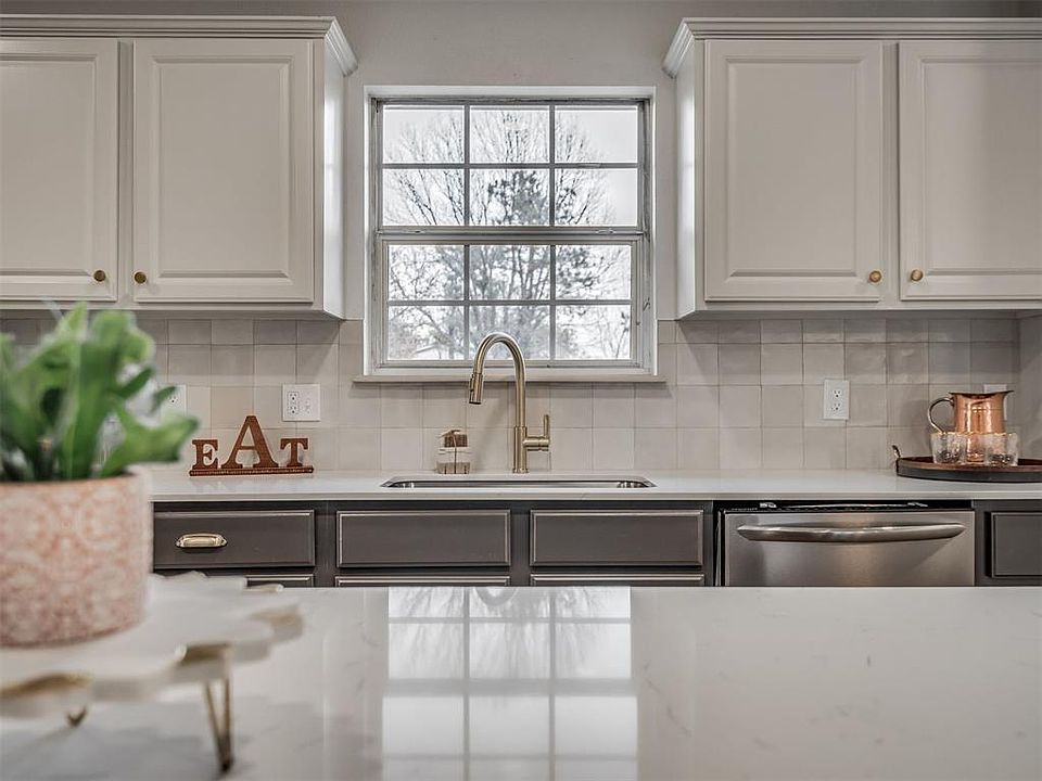 Modern updatesSleek gold finishesBrand-new countertopsNew paintFreshly built back porchFresh open layoutOpen layout