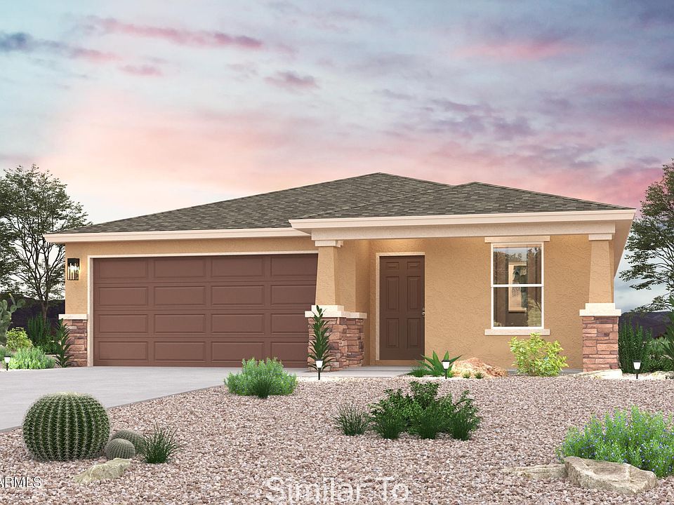 Discover Your Dream Home in the Mesquite Hills! The Alamar Plan features a spacious open-concept design, seamlessly connecting the Living, Dining, and Kitchen areas. Natural light fills the home through low-E insulated dual-pane vinyl windows, highlighting elegant Shaker cabinets, granite countertops, and stainless steel appliances, including an electric smooth-top range, dishwasher, and over-the-range microwave in the kitchen. Retreat to the expansive primary suite with a private bath, dual vanity sinks, and a generous walk-in closet. Each of the two additional well-appointed bedrooms also includes its own walk-in closet. A thoughtfully designed secondary bathroom and a serene patio—ideal for enjoying morning coffee or sunsets.