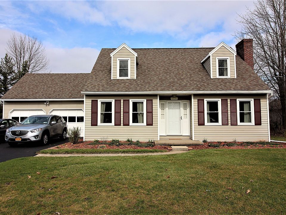 Bright and inviting 4 Bed, 2 Bath cape cod home on a lovely, private plot! Nestled in a peaceful locale just minutes from the village of Canandaigua, this charming property features combination kitchen and dining room area with breakfast bar, cozy living room with wood burning fireplace and first floor laundry for complete ease! Upstairs features spacious bedrooms with beautiful dormered windows, and master bedroom includes giant walk-in closet and private entrance to bathroom! Large, park-like yard is wooded on three sides for privacy and offers tons of room to roam! This home has all of the amenities and space to spread out without being too far from the city - walkthrough now!