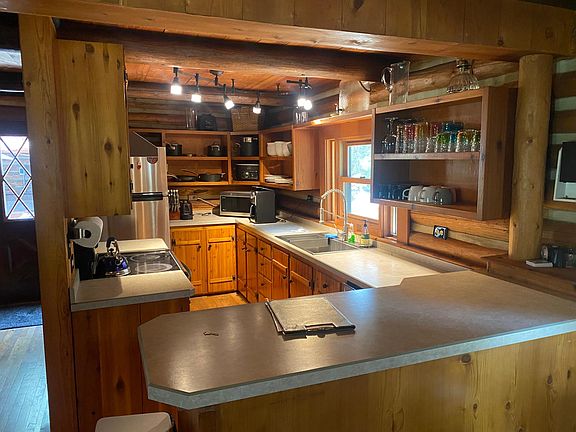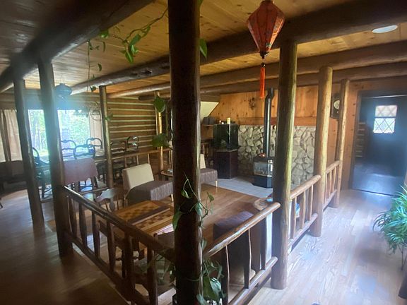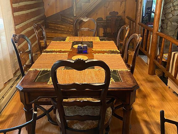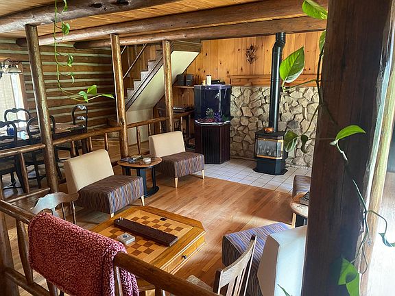 This log home has 3 bathrooms that are new, bedrooms are new, the flooring, beds, paint etc. 70 inch tv on the wall with surround sound in the upstairs living room.