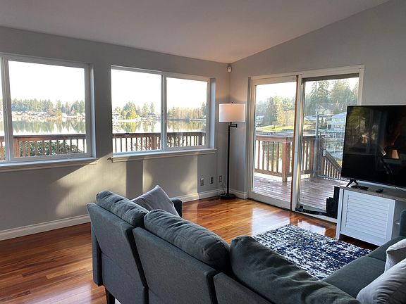 Lakefront living on Lake Tapps! Amazing views of the lake. Light-filled 3 bedroom, 2 bath home, recently updated and fully furnished. Property is adjacent to wet lands on one side for plenty of privacy. Experience total tranquility and peace watching bald eagles soar and water fowl play. Amenities include a firepit to enjoy an evening fire at the edge of the lake.