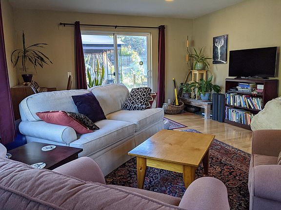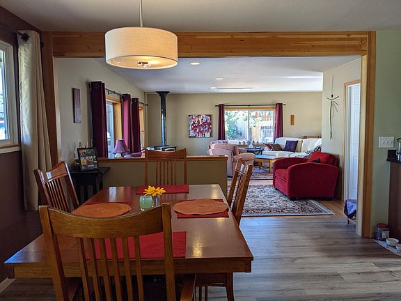 2 bed, 1.5 bath, 1600 sqft, tastefully remodeled inside and out. Snuggle up to the woodstove with plenty of wood to use and an additional heat pump heating system to keep the house warm. Lots of windows and natural light in the large living room with multiple seating areas. Back deck overlooking a huge private yard (1/2 acre) with gardens, mature landscaping and a Teepee structure. Main bedroom has a king-sized bed. Second bedroom has a twin. Both beds are newer, memory foam with toppers and are very comfortable, with new bedding. Antique oriental rugs, carpet, oak and luxury vinyl plank flooring. Artwork throughout the home. Fully equipped open concept kitchen with granite counters, large island and large walk-in pantry. High speed internet, WIFI, bluetooth sound system, TV with Netflix and Amazon Prime.