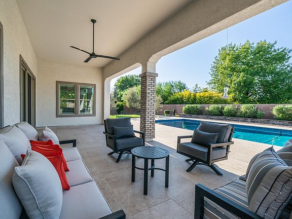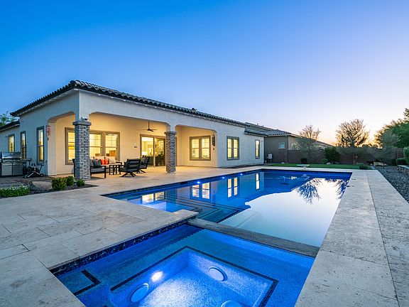 highly upgraded interior amenities, with an incredible backyard, heated pool with Baja Step entrance and spa, Limestone patio and pool surround. Enjoy the Great Room floorplan with wood plank look ceramic tile floors,12' ceilings, Quartz counters and Stainless appliances, including 36'' gas cooktop. Cabinets with 42'' uppers and crown moulding, & soft close cabinet drawers. Adding to the beauty, Hunter Douglas Plantation Shutters throughout. This home is highly upgraded inside & features over the top professional landscaping.