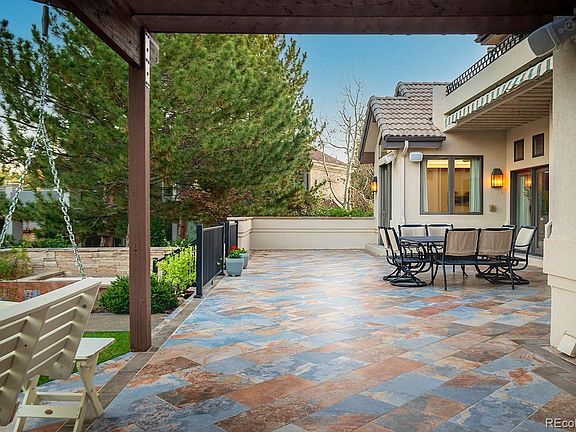 For those who desire the pinnacle of outdoor living, this residence unveils an unparalleled backyard retreat where architecture and landscape converge in perfect harmony. An expansive stone patio spans the full width of the home, crowned by a warm wood pergola and retractable awning for year-round enjoyment. Terraced steps descend to a lower courtyard with built-in seating and a sculptural firepit—an intimate stage for starlit evenings. Meandering flagstone pathways wind through natural rock outcroppings and curated gardens toward a sweeping lawn, while the Colorado mountains rise dramatically beyond showcasing sunsets that unfold as nightly masterpieces. A sense of refinement begins with the home’s curb appeal, where gracefully contoured rooflines, arched dormers and a distinguished portico entry establish timeless allure. Inside, a dramatic foyer introduces the great room, where soaring windows illuminate with natural light and a stately fireplace anchors the design. Expansive in scale and refined in detail, the chef’s kitchen unfolds as a grand stage for both culinary artistry and convivial gathering centered around a slate AGA Mercury 48” induction range and built-in Sub-Zero fridge. Thick granite surfaces sweep across two remarkable islands- one at prep height, the other at bar height- an uncommon luxury creating a dynamic space for craft and connection that flows seamlessly into the dining room and outdoor terraces. The main-level primary suite offers a tranquil escape with vaulted ceilings, an intimate fireplace and direct patio access, while its spa-inspired bath features a soaking tub beneath a skylight, euro-glass shower and walk-in closet. Additional highlights include a main-level office, three upstairs bedrooms- two with private balconies and a finished walk out basement with a custom bar, billiards, media area, two bedrooms, two baths and workshop- all sited on a peaceful double cul-de-sac within a resort-style community offering golf, pool and trails.