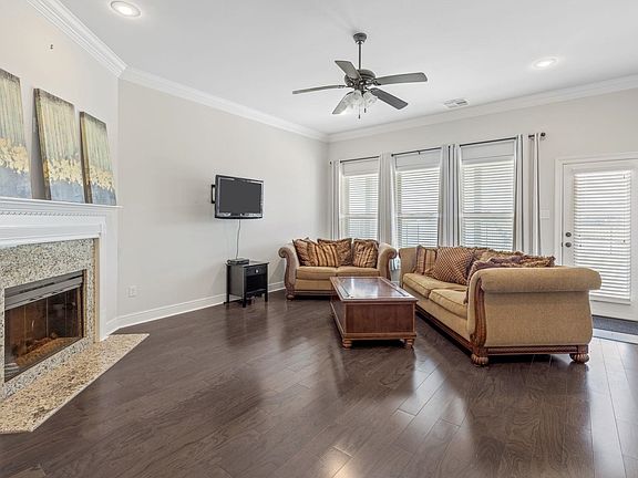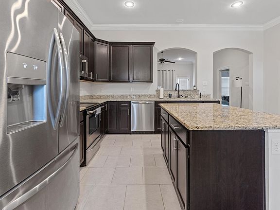 Welcome to the stunning Nerine IV A by DSLD Homes, an energy-smart home where modern living meets efficiency. This beautifully designed 3 bedroom, 2 bathroom home features a spacious open floor plan with elegant wood flooring and a charming corner fireplace with decorative granite mantle, perfect for entertaining and family gatherings. The kitchen boasts 3cm granite countertops, rich birch cabinets, and sleek stainless steel appliances, while thoughtful details like undermount sinks, crown molding throughout, and Pfister Tuscan Bronze plumbing fixtures add sophistication to every room. Ceramic tile in wet areas ensures both beauty and easy maintenance. Retreat to your private master suite featuring a large walk-in closet with double sinks, separate shower, and relaxing garden tub. This energy efficient home includes radiant barrier decking for superior temperature control and a post-tension slab foundation for lasting stability. Additional features include pre-wiring for security systems, a double garage for convenient parking and storage, and a covered patio perfect for outdoor entertaining. The seller has thoughtfully installed a partial privacy fence in the backyard with elegant wrought iron facing the water view, providing both privacy and unobstructed enjoyment of the scenic waterfront.