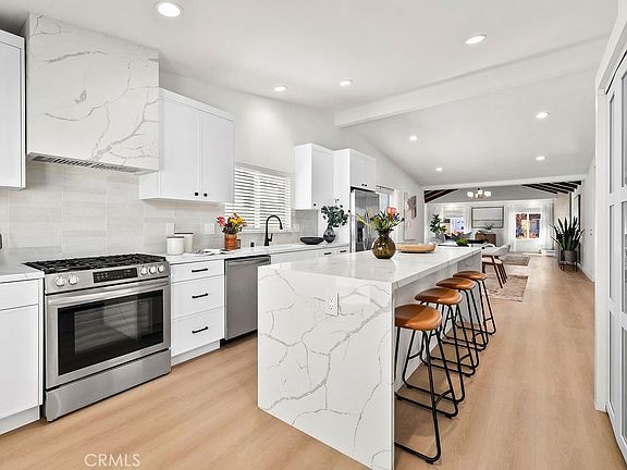 This is a beautifully remodeled single level home within proximity to beloved Huntington Beach. Enjoy entertaining in this warmly designed home. The remodeled galley-style kitchen with new and large pantry, nine-foot quartz island accommodating seating, opens to the dining and living rooms and has new French doors and all new stainless-steel appliances. Lofty ceilings extend to the dining room and to a richly accented wood Cathedral ceiling in the living room. Classy designer tiles truly highlight the fireplace. Of the three bedrooms, two have private three-quarter ensuite bathrooms. The third bedroom has access to the hall full bathroom. All bedrooms, within this great layout, are on one side of the home with kitchen, dining, and family rooms on the other.