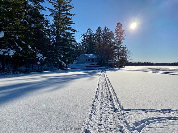 MORE PHOTOS TO COME - Embrace the beauty of every season at this extraordinary 4-season recreational residence on Grindstone Lake, where 245 ft. of pristine shoreline and a private1.2-acre lot invite you to reconnect with nature's wonders. Step into a beautifully renovated, fully furnished 1,700 sq.ft. open-concept home that inspires relaxation and togetherness, with a spacious wrap-around deck offering panoramic lake views perfect for morning coffees, sunset gatherings. or hosting loved ones for unforgettable gatherings, this opportunity provides 2 spacious bedrooms, primary with en suite, and an additional elegant guest bathroom, open concept kitchen, dining, lakeside nooks and games area, every detail invites comfort and relaxation, while the beautifully furnished interiors mean you can start making memories from day one. In 2020 the interior underwent many renovations including hardwood floors throughout, kitchen, bathrooms, a new propane furnace, new windows and sliding glass doors, spray foam insulation throughout the 1500 sqft crawlspace/utility room. The roof was replaced in 2016, and the detached garage with loft area is fully insulated and heated. Enjoy endless recreational trails right from your doorstep, excellent swimming, and a sandy-bottom shoreline with your own private boat launch. Whether you dream of casting a line for bass or trout, exploring crystal-clear waters by boat, or simply savoring peaceful days in the heart of cottage country, this turnkey sanctuary is ready for your next chapter-no renovations required. With year-round road access and thoughtful updates throughout, every detail has been designed to ensure effortless enjoyment and lasting memories. A serene retreat surrounded by nature's tranquility, this property is your canvas for unforgettable moments all year round. Step into a life where every season inspires-your lakeside adventure awaits.