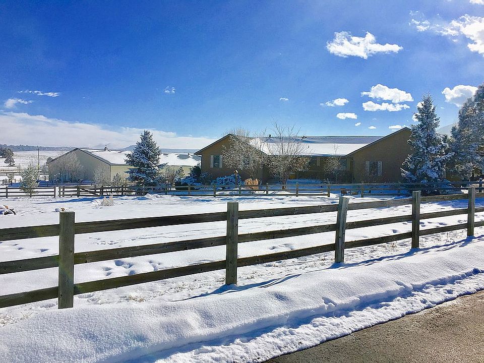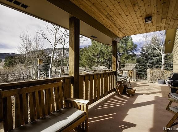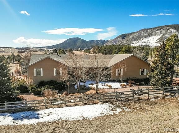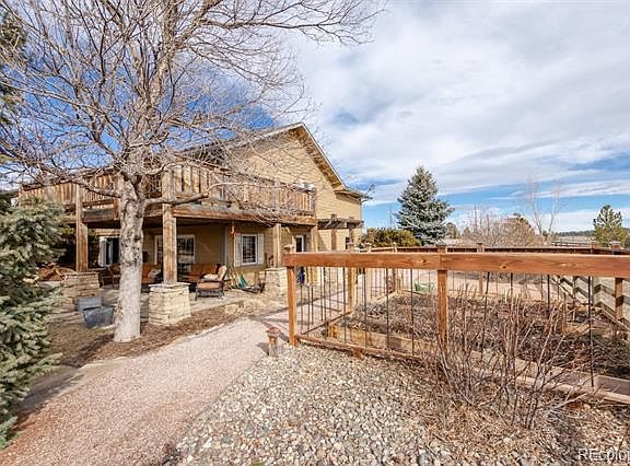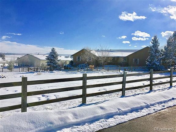 Horse Lover, Pet Lover, & Athlete's Dream Come True! 3550 Sq. Foot Ranch-Style Home with Finished Walkout Basement is on 9.54-Acres with Two Wells, INDOOR 68x120 Dressage Riding Arena, 36x26 Barn, Hay Shed, Loaf Shed all with Tremendous Mountain Views! * Completely fenced with horse and pet-friendly v-mesh lined wood 3-rail fence * Beautifully updated and maintained, this light-filled home with oversized 3-car garage is nestled in a friendly small community at the base of the foothills on paved road between Denver and Colorado Springs. Enjoy an updated kitchen with slab granite counters and stainless steel appliances. The vaulted living/dining room area has a newer Mendota fireplace w/custom Tiger Oak Mantle and access to the spacious south facing view deck overlooking a lushly landscaped and fenced yard. Downstairs, you'll find the family room, a 2nd kitchen w/theatre room (equipment included), fitness room/art studio (could be bedroom #4), and more all walking out to a lush patio.