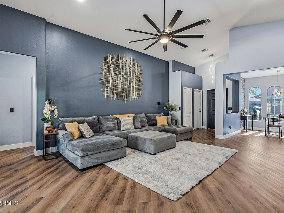 Inside, the vaulted ceilings, arched windows, warm wood-tone flooring, & concrete accent walls create depth & sophistication. The kitchen is a showpiece—rich navy cabinetry, white quartz counters, & two spacious pantries-perfectly balancing modern flair w/ convenience.