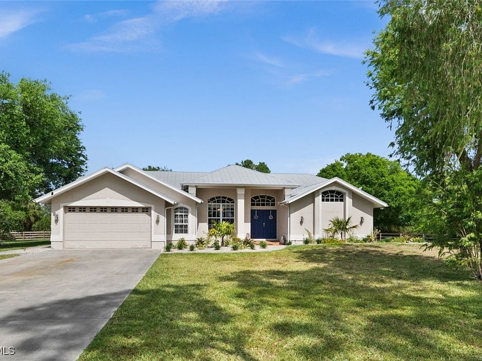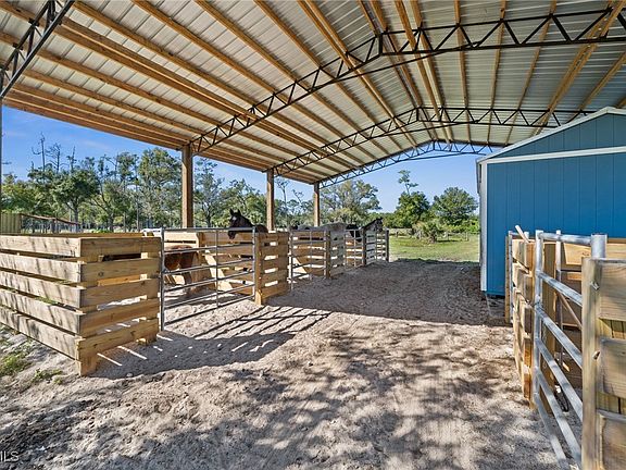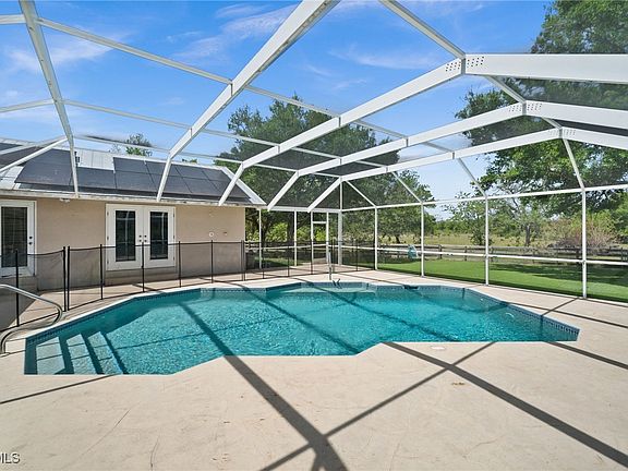 Welcome to 20885 Huffmaster Road! A rare opportunity to own 12.5 serene and fully-fenced acres in North Fort Myers, offering the ideal setting for equestrian living, agricultural pursuits, and peaceful country privacy. This spacious pool home offers over 2,500 sq ft of living space with 4 bedrooms, 3 bathrooms, and a climate-controlled and insulated 2-car garage. Inside, you’ll find a thoughtfully designed split-bedroom floor plan centered around a remodeled kitchen (2018) featuring quartz countertops, island with pendant lighting, stainless steel appliances, tile backsplash, and an inviting breakfast area. The primary suite is a retreat of its own, complete with high ceilings, French doors to the pool, dual walk-in closets, and a luxuriously updated spa-style bathroom boasting a soaker tub, three showerheads, LED accent lighting, Bluetooth speaker, beverage cooler, and chic tile accents. Step outside to your private outdoor oasis, featuring a screened lanai with sparkling pool and a large, covered space under truss for year-round outdoor living and entertaining. A spacious, separately fenced turf area creates the ultimate pet paradise or a private play yard. Improved with your horses and livestock in mind, this sprawling property includes a new pole barn with 5 stalls, a dedicated 20x12 feed shed, detached garage/workshop for storage, RV pad with 50-amp hookup, chicken coop, and upgraded lighting at the entry. Upgrades provide peace of mind, including a new Generac whole-house generator with 500-gallon buried propane tank (2025), mini-split A/C in garage (2025), newer hot water heater (2023), newer pool pump (2024), RO system in kitchen, irrigation system, LED color-changing pool lighting, new electric run to pastures and gate (2025), and a metal roof. And best of all, you won't have to deal with dirt roads to access the property! Homes on acreage of this caliber are incredibly hard to find in Southwest Florida, offering privacy, land, and an equally impressive concrete-block home. Don’t miss this exceptional opportunity. Schedule your private showing today and experience everything 20885 Huffmaster Road offers!
