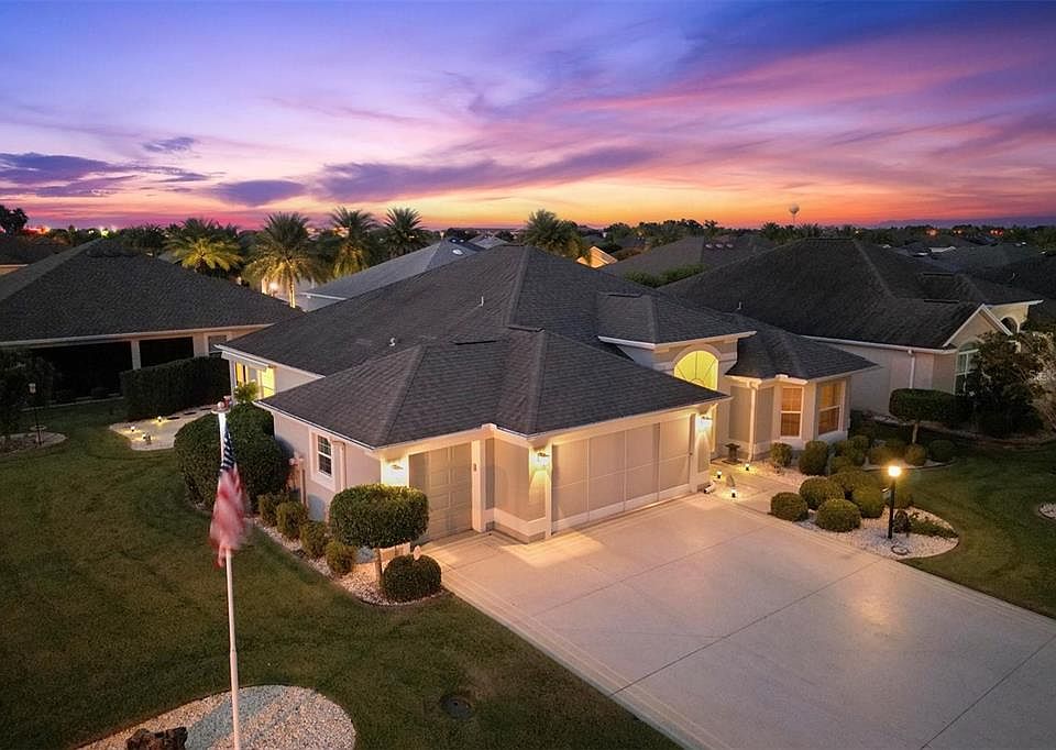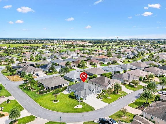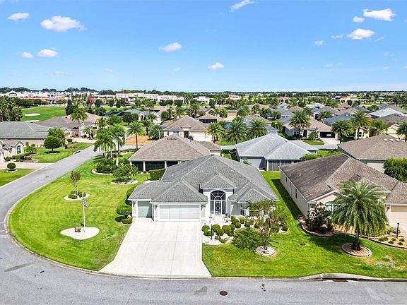 ~ROOM FOR A POOL~GORGEOUS 3 Bedroom, 2 Bath LILY DESIGNER with a 2 CAR GARAGE + GOLF CART GARAGE in the VILLAGE OF PINELLAS! Close to BROWNWOOD PADDOCK SQUARE and LAKE SUMTER LANDING. This ONE OWNER home has been meticulously maintained and is perfectly situated on a CORNER LOT with a SCREENED front porch, SLIDING SCREEN on the garage door + EXTENDED GOLF CART driveway, LIGHTNING ROD system on the roof, lush landscaping, rock beds, GUTTERING, side patio with a REMOTE AWNING and a beautiful ZEN like garden in the back surrounded by PRIVACY BUSHES. Step inside to a FOYER CLOSET, OPEN FLOOR PLAN enhanced by TILE on the DIAGONAL, all rooms have CEILING FANS. The WHITE kitchen cabinets boast above and below crown molding & above & under CABINET LIGHTING, High definition beveled edge laminate countertops, STAINLESS STEEL appliances, newer large single basin kitchen sink, pull-out drawers and a pantry. Relax or entertain in the spacious GLASS-ENCLOSED lanai under HEAT/AIR w/a mini split featuring tile flooring and sliders that open to screens. Fall in love with the very private ZEN like garden surrounded by privacy shrubs. Off the lanai is a patio with an ELECTRIC AWNING that includes a SHADE SCREEN surrounded by butterfly bushes and flowering Plumeria and other plants. This LARGE lot has ROOM FOR A POOL-Sketch is in the attachments. The primary suite impresses with a TRAY CEILING, large walk-in closet with multiple levels, EN-SUITE bath with decorative tile Roman shower, DUAL sinks, and a private toilet area. The guest area offers a POCKET DOOR for privacy, two spacious bedrooms: one with a tray ceiling, the other with a vaulted ceiling and a beautifully appointed guest bath. The laundry room is just off the kitchen and has added cabinets: The WHIRLPOOL washer/dryer conveys and is 1 year old. Additional highlights: Home is equipped with an ADT Security system, An additional OmniShield Home Safe Network System that detects Smoke-Heat-Carbon Monoxide-Water and includes a Bed Shaker that alerts you by sound and vibration, Exterior painted 2024, Lightning Rod System, Gutters, Painted driveway, screened front porch, pull down attic stairs, utility sink in garage, New Primary bathroom faucets 2025, New Garbage disposal 2025, New Sprinkler heads, Carpet in bedrooms 2 years old, Wireless rainfall sensor, Water Heater 2019, Roof is 2013, HVAC is 2012. You'll see pride in ownership in this home! Don't forget to watch the video and schedule your private showing today!
