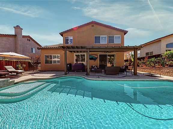Beautiful and well cared for pool home with 4 beds/3 baths (could be 5th bedroom downstairs, has full bath) on this very nice street in the heart of Orangecrest. Custom built-in entertainment center in family area. Stainless appliances, walk-in pantry & kitchen island. Has upgrades like Luxury commercial grade Vinyl Plank floor, Modern lighting fixtures, Plantation shutters downstairs and master bedroom, Tankless water heater & commercial tankless instant Hot water & exterior repainted last year. Master Bathroom has a frameless shower, free-standing tub & remodeled vanity. Saltwater chlorination pool, internal controls & solar pool heating saves you $$. Alumawood patio cover with fans makes this even more appealing in the summer. Low taxes and no HOA. This property is a must-see.