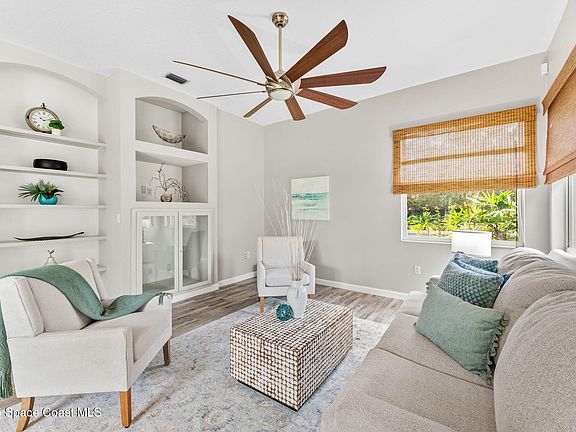 Located in Baytree's gated golf community, this 4-bedroom, 2-bath home blends comfort, security, and style. Accordion shutters cover every window, with electric screen shutters enclosing the patio for instant storm protection. A 2019 roof, 2022 HVAC, and 2020 water heater add confidence, while crown molding and updated flooring define the interiors. The kitchen is designed to impress with quartz counters, a large island, stainless steel appliances, solid wood cabinetry, pantry, breakfast bar, and wine cooler. Bedrooms are finished in carpet, baths in tile, and main spaces in durable laminate/LVP. Beyond the home, Baytree offers resort-style amenities including a pool, clubhouse, tennis courts, and picnic pavilions, all just moments from The Avenue Viera, where premier shopping, dining, and entertainment define the lifestyle.