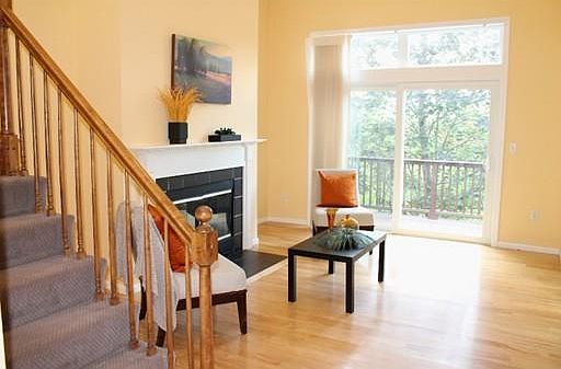 Nestled on a hill in a highly desirable complex, this end unit boasts spacious first floor living area with a fireplaced living room with balcony, formal dining room, half bath, updated kitchen with ceramic tile floor, maple cabinetry and granite countertops. Master bedroom with en-suite bath and large second bedroom and additional full bath complete the second floor. Finished lower level has a bonus room that can be used as a guest bedroom, office or playroom, full bath, and slider to the patio. Attached garage conveniently leads to first floor. One pet only (cat or dog) under 25lbs