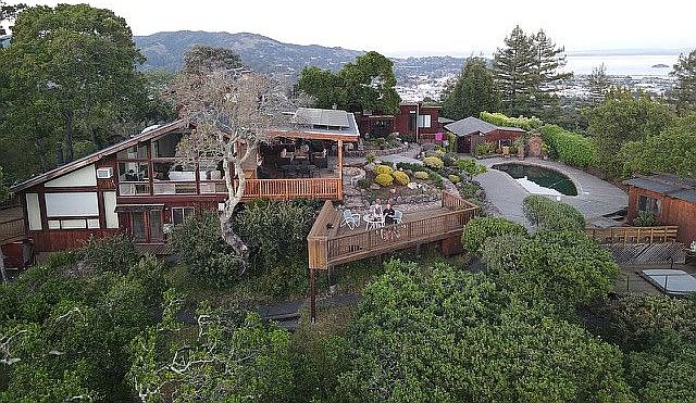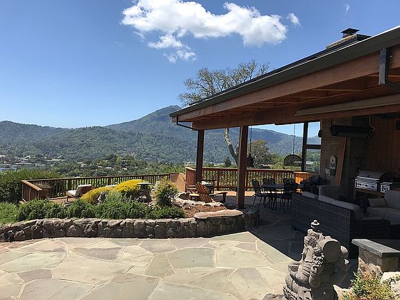This 4250 square foot architect designed single family home, located at the top of Bret Harte Ridge, has 360 degree sweeping views of Mt. Tam and the bay, 5 bedrooms and 5 bathrooms. There are three large decks with views, an 800 square foot veranda with BBQ, wet bar and pizza oven, a full-size bocce court with gazebo, 75 photovoltaic solar panels provide total house electric power and a 20K whole house natural gas generator, with transfer switch, provides back-up power. It has a free-form solar heated swimming pool, hot tub, wine cellar, workshop, 2 outside store rooms, 1 wood and 2 gas fireplaces, an exercise room and hardwood floors throughout. Property is fully fenced and gated with landscaping that includes 30 mature California live oak trees and extensive paths and rock walls. Off-street parking for ten cars.