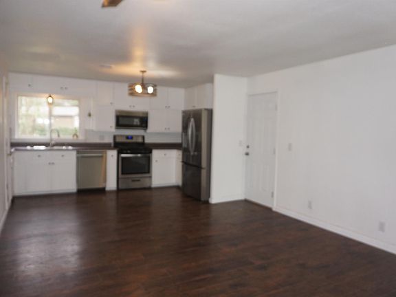 Super cute 3 bedroom house with an enclosed garage and new windows, new flooring throughout, new light fixtures, and freshly painted inside ! Very open living dining kitchen, lots of countertop space, new stainless appliances in the kitchen and the Refrigerator and Washer/Dryer Combo machine stays. Nice size laundry room with storage cabinets and a folding cabinet plus storage underneath that. Back door goes from the laundry room out to the fenced in back yard and there is a driveway that goes from the side street to the back yard. Bedrooms all are good size and have nice closets. Bathroom has a nice large vanity and a great linen closet. Not far from the freeway, and close to the School.