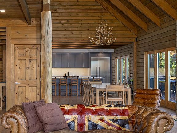Inside, every inch feels intentional. A double-height great room with exposed beams and a massive stone fireplace creates the kind of gathering space that defines a mountain home. Floor-to-ceiling windows pull in the light and the landscape, while the open kitchen and dining area make entertaining feel as effortless as the first run of the day.