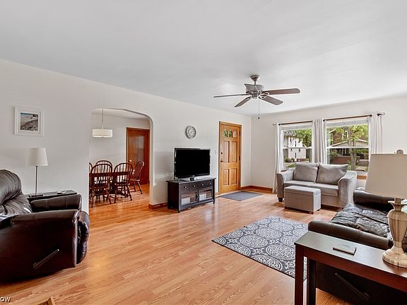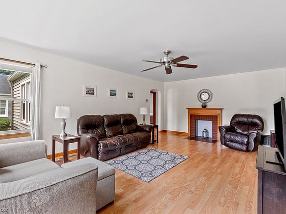 This ranch-style home offers a comfortable and convenient layout, perfect for those who prefer one-floor living. The well-maintained property features a charming front porch that creates a welcoming entrance for your guests. Inside, you'll find a spacious living room with a decorative fireplace, dining room, and an eat-in kitchen with abundant amount of counter space, providing plenty of room for hosting holiday gatherings. During the summer months, you can take advantage of the private patio and the large open backyard, ideal for outdoor parties and relaxation. The three bedrooms in the house have hardwood floors, adding a touch of warmth and elegance. The full bathroom on the first floor has been updated, ensuring modern convenience and style. Furthermore, the basement offers even more versatility with a full bathroom, making it suitable for various purposes such as entertainment, exercise, a playroom and additional storage. If you find yourself in need of additional storage space, t