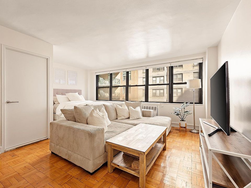 Updated and spacious alcove studio at 209 East 56th Street, a full-service cooperative building in Midtown East's Sutton Place.