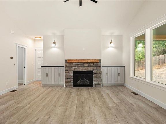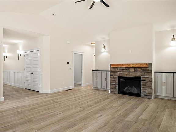 Stunning rancher on a ½ acre lot, just a stone’s throw from Lake Spokane/Long Lake with exclusive Lakeridge Park membership for boating and private lake access! Built by renowned builder Mike Miller, this thoughtfully designed home features a main-level layout with 3 bedrooms, 2 bathrooms, and high-end designer finishes throughout — including stylish black and gold hardware, shaker cabinetry, and quartz countertops. Enjoy the spacious, open-concept living area with Cafe Series appliances, wide plank LVP flooring, wood-wrapped windows, and a striking vertical wainscot entry wall. The modern open stair rail leads to a large unfinished basement w/ potential for more bedrooms, bathroom and a family room. Stay comfortable year-round with a gas furnace and heat pump. Take advantage of the oversized 3-car garage, complete with a deep 3rd bay and 10' wide door-perfect for trucks, toys, or a workshop. Relax or entertain on the 21x15 covered deck, surrounded by natural privacy and mature trees.