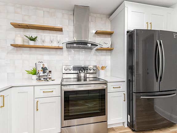 Large storage buildingRocking chair front porchRemodeled bathAdorable backyardSparkling quartz countertopsStylish tile backsplashSleek cabinets