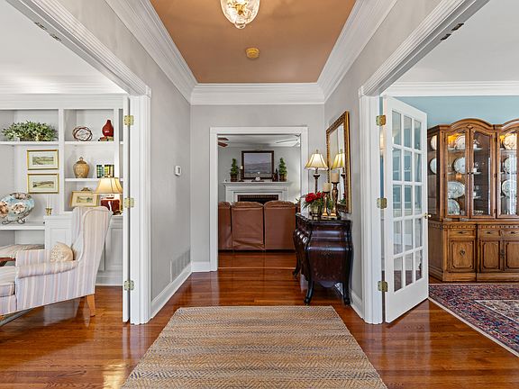 You won't want to leave this beautifully decorated and meticulously maintained 4BR/3.5BA Colonial on 1 acre in desirable Ridgehaven. A deep, sweeping front porch welcomes you into a grand foyer flanked by a dining room & office w/French doors & custom built-ins. The handsome kitchen features an island, granite tops, gas cooktop, all appliances, pantry, and a spacious breakfast area that flows into the dining & great room. The great room offers wood flooring, a gas fireplace, and ample space. Main floor primary suite boasts a sitting area, spa-like bath & dream custom closet. A discreet rear staircase leads to a second primary suite + additional 2BR's sharing a Jack-and-Jill BA. Walk-out attic storage & full unfinished walkout basement provide amazing potential to expand or customize. The private back deck with retractable awning is the perfect space to entertain or relax & connects to a detached 2-car garage w/a large bonus room above—perfect for a home theater, studio, or guest retreat. Expansive driveway, large laundry w/sink, 1/2 BA for guests, expansive yard w/lush landscape backing to farmland, and timeless Southern charm complete this timeless home.