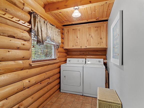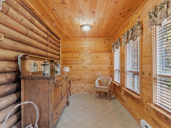 Chalet-style log homeThree bedroomsTwo car garageWaterfront viewsExterior balconiesBeautifully crafted with logs
