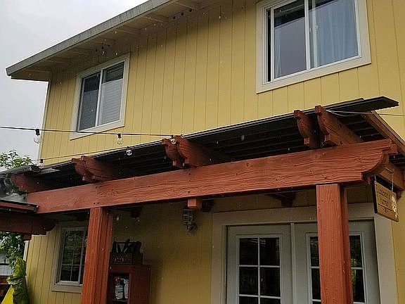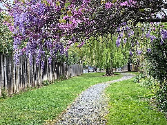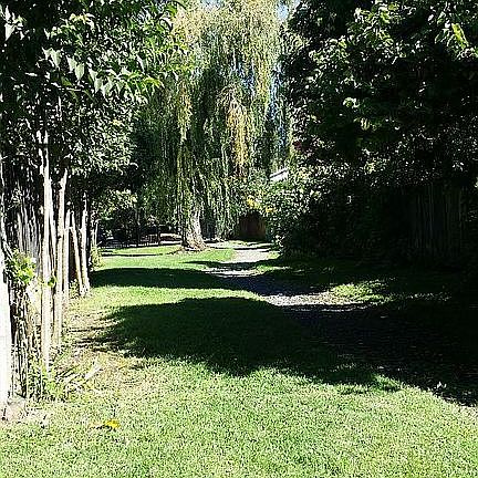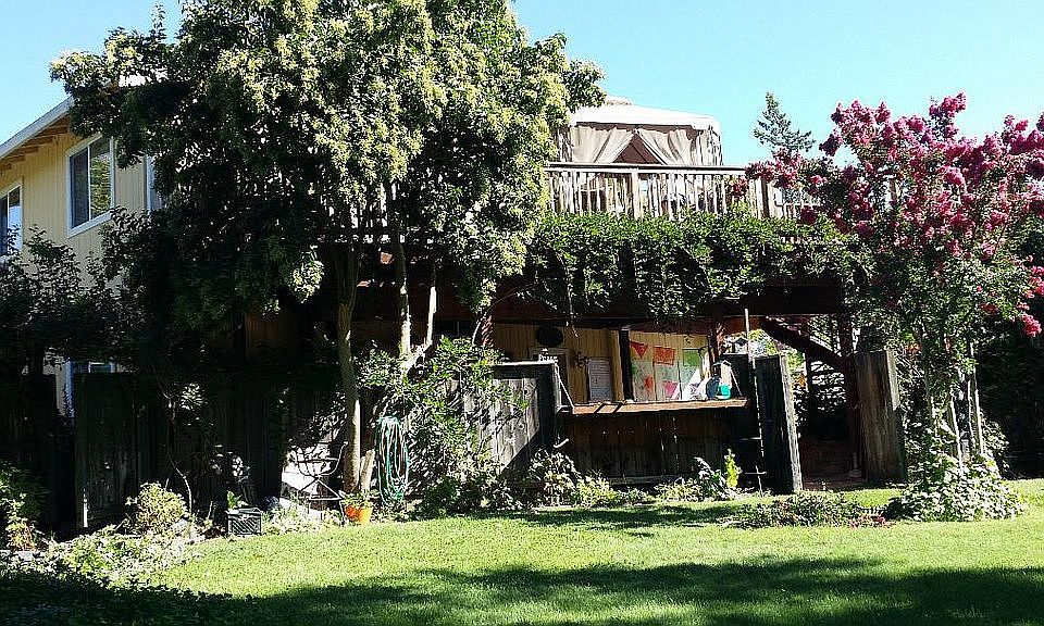 Cul de Sac, gardens surrounding all three sides. Pool. Hot Tub, New Fencing, 1,000 square feet of Second level decking attached, creating equal sized shaded space beside pool and deck. 3 sheds for storage, Fish Pond. Fruit Trees, Redwoods, Court Yard, River Access, River View, opens onto Extended Garden area with Italian Cork Trees, Rose Garden, brand new roof, brand new furnace and ducts, new floors, newly remodelled kitchen, wooden floors upstairs, brand new air scrubber filter. 20 min walk to plaza.