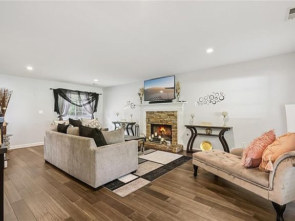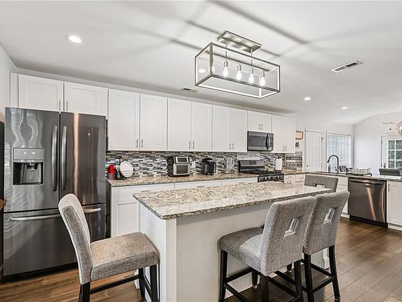 Stunning stone fireplaceSpacious primary suiteGleaming hardwood floorsWide front porchOversized island with seatingModern kitchenOversized level yard