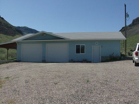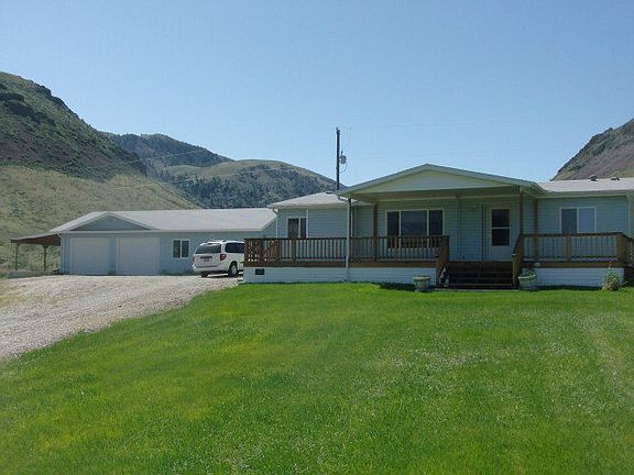 Clean and well maintained custom built 3 bedroom, 2 bath modular on three lots totaling 9/10th of an acre. This cozy home has electric forced air heat and also a wood stove in the living room for those quiet evenings. There is a two room storage building off the covered full length rear deck and patio area to store all your recreation gear or whatever. The 30 x 48 garage and shop with covered camper storage is insulated with a large overhead propane heater. The shop area is perfect as a hobby room. The home was designed to offer the finest views of the mountains, valley and river. The property is nicely landscaped with a nice lawn and many trees. There is also an underground sprinkler system for all the lawn area. This home borders BLM and has very little traffic.