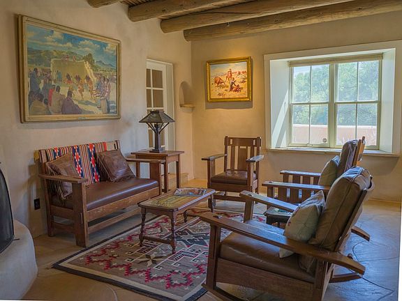 This remarkable adobe home, nestled in Taos's historic district, offers a rare glimpse into the town's rich artistic past, having once served as the residence and gallery of Taos Modernists painters Beatrice Mandelman and Louis Ribak. Originally constructed in 1880, the property underwent a thoughtful remodel in 2006, seamlessly blending its historic charm with modern amenities. Entering this 3280 sq ft property, you will feel the exceptional detail of craftsmanship and mindfulness for those seeking a truly distinctive property. The home features an extraordinary two bedroom/two bath main residence and a separate well-appointed one-bedroom/one bath apartment/studio all under one roof. Stepping into the heart of the home, there is a cozy parlor/dining area with a southwestern fireplace, and deep set windows. Thick walls and wood floors are found throughout the house. Prepare to be enchanted by the adjoining whimsically designed kitchen, featuring a Viking stove and lively, painted cabinetry and ample storage. It's a space designed to spark joy and inspire your inner chef. Adjoining the parlor area is the large living room designed for both artistic inspiration and grand gatherings, and with a rich history of Taos lore. A guest bath is perfect and adds to its versatility. Upstairs, the primary suite is a sanctuary of comfort and privacy. The landing, lined with built-in cabinets, leads to a generously proportioned bedroom and oversized bath and attached closet. A cozy sitting area offers ample space for relaxation. French doors invite you to step out onto the front balcony or the rear Juliet balcony, each offering a unique perspective of the Taos landscape. The apartment/studio/guestroom offers a large living area, an upscale kitchen, and a southwestern fireplace. Access to a private, stone-terraced back courtyard, is perfect for relaxation and contemplation. Authentic New Mexican features abound, including vigas and lattilas ceilings, four southwestern fireplaces, natural mud plaster walls and nichos, and a mix of flagstone, reclaimed wood, and Saltillo tile flooring. Hand-painted beams and carved corbels add unique details. Other amenities include radiant floor heating, double-paned windows, and custom screen doors. The property includes a gated front courtyard, w/ spruce and fruit trees, a fruit tree orchard (pear, apple, apricot), and a private walled backyard with rock landscaping. Sustainable features include two cisterns for water collection, a gardening sprinkler system, an air exchanger in the laundry room, and solar panels with a natural gas backup for up to 12 hrs. of hot water. This exceptional property offers a unique opportunity to own a piece of Taos history, seamlessly blending historic charm with contemporary comfort.