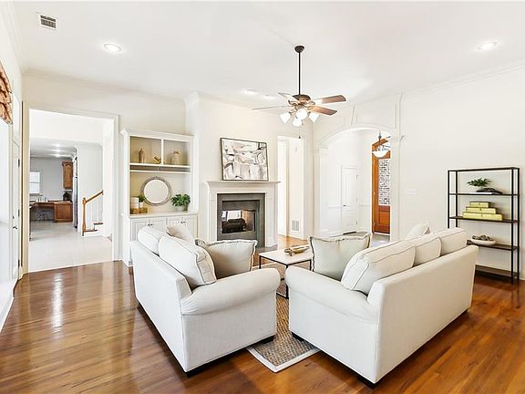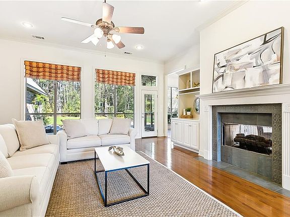 Fabulous home in demand Southdown Subd! Amenities include: 4 bedrooms/3.5 baths; bonus up with full bath could be used as 5th bedroom; wood floors in foyer, den, formal dining and primary bedroom; two sided gas fireplace in den also opens to dining room; kitchen with granite countertops, stainless appliances including double ovens (one is convection) and 5 burner gas cooktop, large desk area; breakfast room; large primary suite; plantation shutters; extended patio in rear yard with stone firepit; putting green; whole house generator (2021). 2 AC&H units: one replaced (2024) and the other was replaced 4-5 years ago. Roof replaced (2021). Flood zone "C". Don't miss seeing this one!!