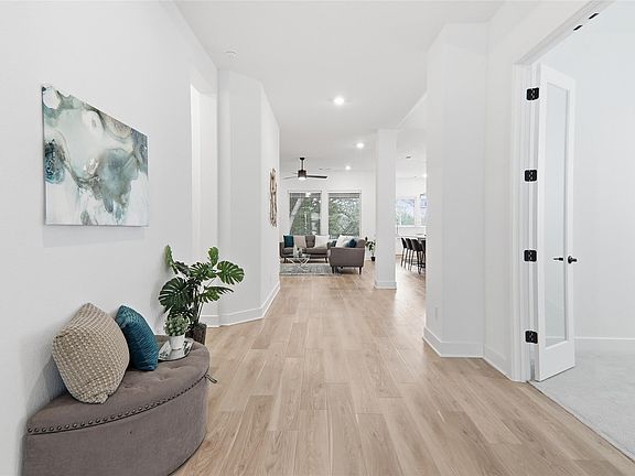 Built in 2023 by David Weekley Homes and impeccably maintained, this stunning residence offers thoughtful design, elegant finishes, and a rare park-like setting in Wolf Ranch. The open-concept living area is filled with natural light and anchored by a beautiful fireplace, creating a warm and inviting space for everyday living and entertaining. The expansive kitchen is a true centerpiece, featuring an abundance of cabinetry, generous counter space, and seamless flow into the dining area with built-in cabinets. A private flex room with French doors provides the perfect space for a home office, study, or additional living area. The luxurious primary suite is a serene retreat with a seamless glass shower, soaking tub, dual vanities, and an oversized walk-in closet. Two secondary bedrooms share a Jack-and-Jill bath, while a third full bathroom offers added convenience for guests or family. A highlight of the home is the extra-large screened-in back porch overlooking the backyard and wooded open space—no rear neighbors—offering privacy and peaceful views year-round. Additional features include a charming front courtyard-style patio, three-car garage, and exceptional attention to detail throughout. Located in the elevated Hilltop section of Wolf Ranch with easy access to the San Gabriel River and walking trails, this home combines modern comfort, privacy, and an exceptional lifestyle in one of Georgetown’s most desirable and amenity-rich communities.