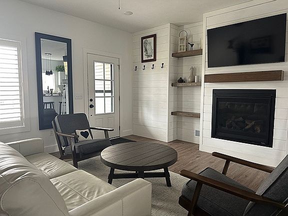 Open floor plan with 9' ceilings and luxury vinyl plank flooring. Living room centers around a cozy gas fireplace framed by custom built-ins, flowing seamlessly into the dining area and modern kitchen with granite countertops. A vaulted sunroom flooded with natural light opens through a full-view glass door to your private outdoor oasis featuring a custom pergola and carefully planned perennial gardens in your fenced backyard. Main floor primary suite with en-suite bathroom and walk-in closet, plus a second bedroom, mudroom and laundry room.