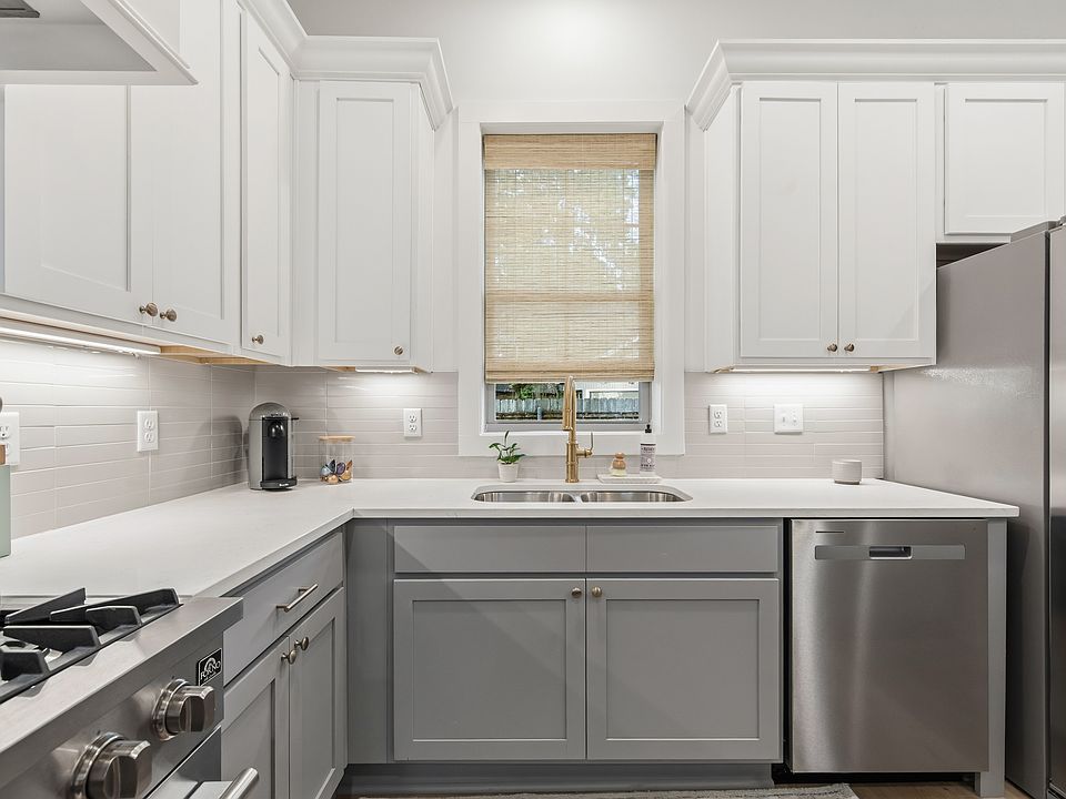 Stainless appliancesQuartz countertopsDesigner-selected fixtures