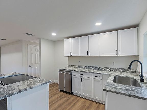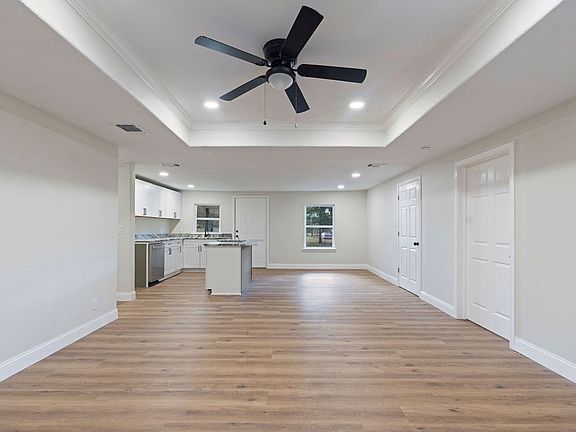 Beautifully updated 3-bed, 2-bath home with a bright open-concept layout and a split floorplan for added privacy. The spacious living area features a stylish tray ceiling detail that continues into the primary suite, adding character and warmth. The kitchen offers brand-new appliances, quartz countertops, and new cabinetry, along with fresh flooring and paint throughout the home. The primary suite includes double vanities, a walk-in closet, and an updated bath. Additional improvements include all new windows, doors, siding, insulation, HVAC, roof, gutters, and fencing. Outside, the large fenced backyard offers plenty of room to play or relax.