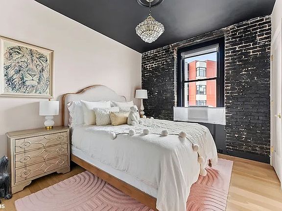The primary bedroom has 4 oversized windows. The room is bathed in light due to western exposure. This huge bedroom has a built-in desk/workstation, discrete built-in shelving and a floor to ceiling customized closet. Everything has its place. The second bedroom is the perfect retreat with its high ceilings, warm, exposed brick and gorgeous crystal chandelier.