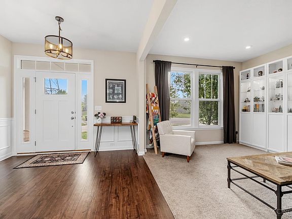 This stunning Fisher Blair model is in Butterworth Glen w/ walking trials & stocked ponds. Moments from Historic Downtown Loveland & the bike trail. Located on a quiet cul-de-sac, thoughtfully designed 4-bedroom, 2.5-bath offers a perfect blend of modern comfort, artistic flair, & natural beauty. Step inside to discover custom cabinetry, statement feature walls, and a layout that truly flows. The functional kitchen is a chef's dream complete with premium appliances, ample storage, and generous counter space, all centered around an inviting morning room with a built-in coffee bar/buffet, perfect for starting your day with sunshine and serenity. The rec room boasts a speak-easy vibe, offering a unique & cozy space to relax or entertain. The primary suite is a true retreat, featuring sitting area, ensuite bath, walk-in closet. Enjoy outdoors w/ $30k in hardscaping, stylish pergola, lush landscaping that provides both privacy and beauty. EV Charger in garage!