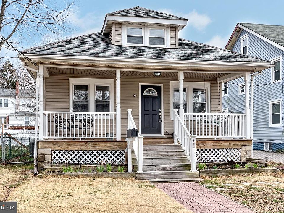 A perfect blend of modern touches coupled with old charm! This Merchantville Bungalow offers plenty of updates and a convenient location to Philadelphia. With vinyl siding and vinyl clad windows, this home brings in tons of natural sunlight throughout. Open front porch features a hanging bench swing and room for outdoor dining. The inside shotgun-style living space offers refinished original wood floors, a cozy dining room space, and an adorable kitchen featuring white shaker cabinets, granite counters, stainless steel appliances, and an exposed brick chimney! The rear of the home boasts a spacious family room with closet space and main floor laundry area as well as 2 rear entry doors. Two bedrooms and the renovated full bath complete this level. The second level of this Bungalow has been finished into a 3rd bedroom, with ample closet space and lighting. Full basement for storage with bonus Hobby Room and half bath. Only a few blocks to Wellwood Park & Playground, Immediate access to Rt. 130 and public transportation, and only 3 miles to either the Cherry Hill Mall or the Collingswood Patco station!