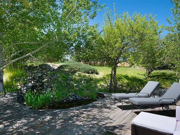 Built into the hill side, this charming 3bedroom/2bath home on 3+ lots is located just a few blocks from Ennis School, downtown shopping and the famous Madison River. This special home with big bay windows in the living room and an updated kitchen with stainless steel appliances and a great breakfast bar offers a convenient floor plan with the primary bedroom upstairs and two spacious bedrooms downstairs. The backyard is a surprising oasis offering privacy with mature fruit trees including pear, plum and apple trees. There is a water feature/stream running into a small pond, a hot tub and additional deck space for exterior entertainment or enjoyment. A two car attached garage is accessible from the alley and a separate yoga studio with a built in sauna all make this home a must see to appreciate all the extra attributes!!