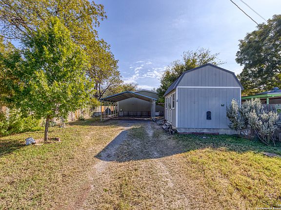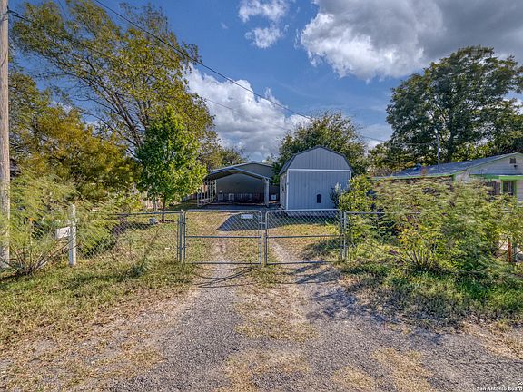 This 1,860 sq ft Palm Harbor double-wide manufactured home blends quality construction with comfortable small-town living. Set on a fully fenced quarter-acre lot, the property features a two-car carport, several mature shade trees, and a storage unit that can be included at an additional cost. Inside, you'll find sheetrock walls throughout, large windows that fill the home with natural light, and elegant coffered ceiling treatments in the living room and kitchen. The open layout offers a welcoming living area with a wood-burning fireplace and a beautifully designed kitchen featuring a large island with pendant lighting, stainless steel farmhouse sink, and plenty of cabinet and counter space. The kitchen comes fully equipped with a stove, microwave, dishwasher, and refrigerator. Durable vinyl flooring runs through the main traffic areas for easy care. The home includes three comfortable guest bedrooms, each with its own walk-in closet, and a spacious guest bathroom with a tub/shower combination and ample counter space. The primary suite is oversized and private, complete with dual vanities and a custom-tiled 72-inch walk-in shower. A separate laundry room off the back entrance doubles as a convenient mudroom area. Located in the highly rated Knippa ISD, this property offers a peaceful lifestyle in a friendly rural community. It's just about 15 minutes to Uvalde for shopping, dining, and medical services, and roughly an hour and fifteen minutes to San Antonio