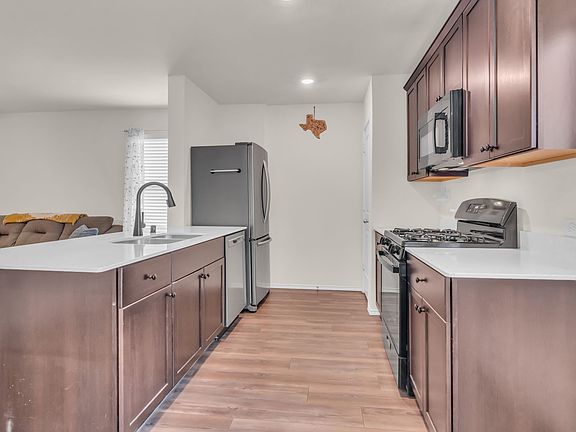 209 Wishbone Lane, where 'move-in ready' isn't just a promise it's a lifestyle! This adorable 3-bedroom, 2-bath home, built in 2020, checks all the boxes whether you're just starting out or looking to downsize or just craving the ease of one-story living. The open-concept design features gorgeous LVP flooring throughout the main living areas (translation: it's stylish and kid-pet-guest friendly), sleek quartz countertops, a stainless steel under mount sink, and Moen chrome fixtures that give the kitchen a polished finish. You'll love the thoughtful extras window coverings throughout, an extended poured-concrete patio perfect for Texas sunsets, garage door openers, and a 16 SEER HVAC to keep you cool without shocking your electric bill. Located in the sought-after Sendera Ranch master-planned community, you'll enjoy access to top-rated schools, nearby shopping, and services within walking distance. Quick access to Highway 287 means your commute stays short, so you can spend more time enjoying community amenities or relaxing on that fabulous back patio. Low-maintenance, high-style, and ready for its next chapter this home is the perfect mix of comfort, convenience, and charm. All that's missing is you (and maybe your favorite welcome mat). WASHER AND DRYER INCLUDED.