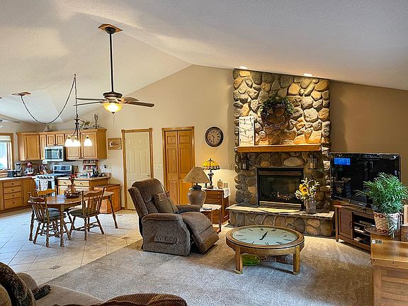 Open concept design with 3 bedrooms and 2 full baths. Large entryway with tile floors through dining and kitchen hallway. Three bedrooms on the main level with wood floors. Lovely owner suite, good size closet, custom tile shower with glass door. Large living room with gas stone fireplace, bright large kitchen with cathedral ceilings, stainless appliances. Access the large backyard deck from a patio door out the living room area. The basement has a finished rec room, workshop area, lower level bedroom if you put in an egress window, and a large storage utility area. Cable high-speed internet, private well and septic, and natural gas. Hangout out by the firepit area, snowmobile, and 4-wheeler trails right nearby and within walking distance to the deed access on Lake Nokomis. Deeded access has a private boat launch, swimming area, and docks that have been first come, first serve. Two car attached garage.