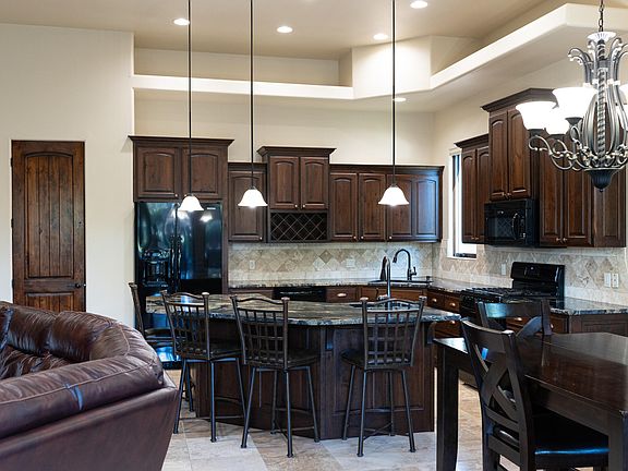 East facing back yard with no neighbor behind. Custom built home with 2185 square feet in Tuweap Point HOA - a gated community. There are two full master bedrooms with master baths. There is also a third bedroom and bathroom. The home has 10' ceilings with 12' ceiling in kitchen/living/dining area. The interior doors are all 8' solid wood stained and the windows are all stained wood trimmed. There are beautiful granite countertops throughout and Travertine Tile with carpet in the bedrooms. The master baths have dual showerheads. Central Vac system and includes all appliances. All furnishings are also included excluding artwork and indicated items. The landscaping is complete and mature and is beautiful with full exterior sprinkler system and accent lighting. There is a community pool, hot tub, and fire pit. This is a home you need to see.