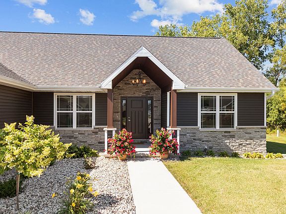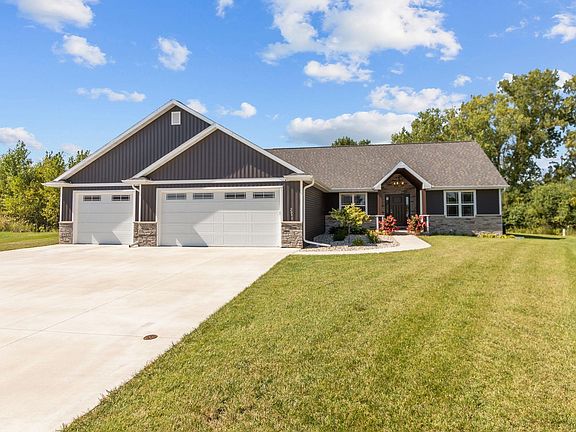 Better than new! Road is paid for, lawn is in, move in & enjoy! Beautiful 3-year-old custom ranch set on a nearly 1 acre cul-de-sac lot. Desirable split-bedroom layout with quality finishes throughout. The spacious great room includes a gas fireplace and flows into the kitchen with granite countertops, center island, and walk-in pantry. Dining area with beamed ceiling and patio doors leads to the covered patio. The primary suite offers a walk-in shower and dual vanities. Main-floor office or flex room. Partially finished lower level includes a large family room and oversized 4th bedroom, plus direct stair access to the heated, insulated 4+ car garage. The garage features a 60’ deep 3rd stall, rear overhead door to the backyard AND a walk-up attic. Covered patio overlooking wooded backdrop.