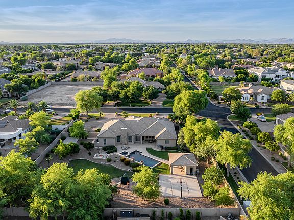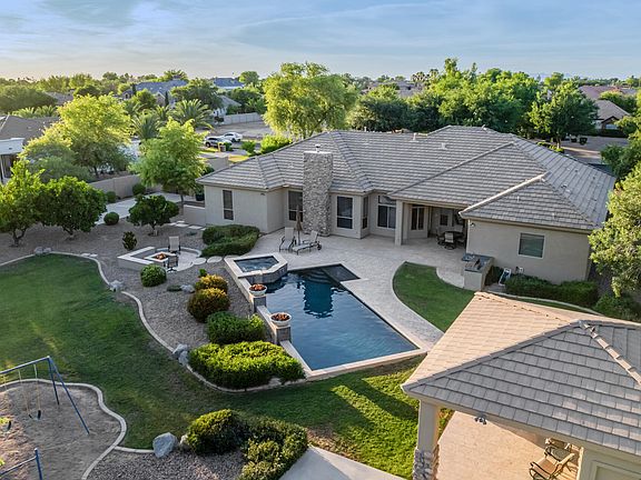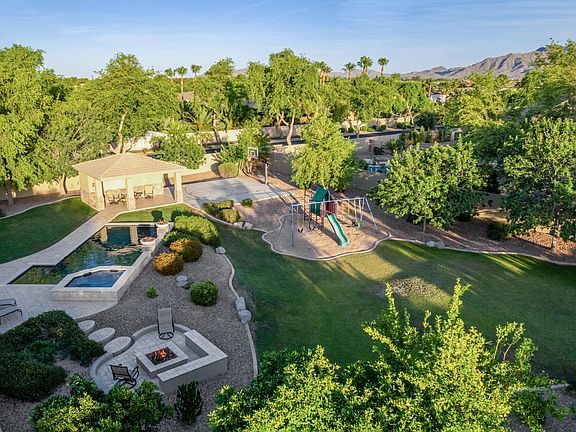 The perfect blend of elegance and comfort in the most coveted neighborhood! Perfectly situated on a corner lot with a circular driveway and mountain views. Enter through the iron front double glass doors into a grand foyer, leading you effortlessly to the formal dining room, private office with custom built-in desk/murphy bed and living room with high tray ceilings and elegant travertine flooring. The heart of the home is the gourmet kitchen with high-end appliances, granite countertops, custom cherry cabinets, pull out shelves, gas cooktop and large island with seating that opens to the Breakfast Area and Family Room with Gas Fireplace. A spacious master suite features a walk-in closet, double vanity, soaking tub, walk-in shower and double door exit to the back patio. Plus, three additional bedrooms with walk-in closets and an option to convert the den into a fifth bedroom. Your backyard desert oasis awaits...the perfect blend of water and fire with an ocean blue pebble sheen play pool, complete with heated spa, outdoor kitchen, separate fire pit seating area for cozy gatherings, shoot hoops on the half basketball court or enjoy the ramada and playground. Take advantage of the 40-foot by 15-foot slab parking behind the RV gate. This outdoor space has it all. Come Discover Your Dream Oasis!!