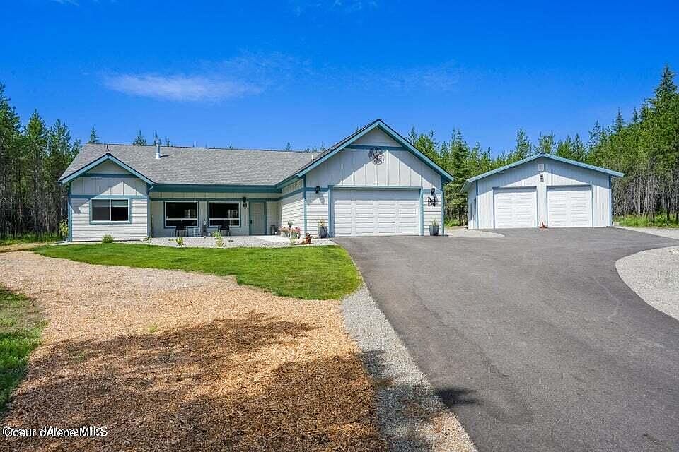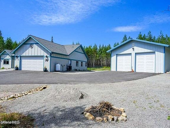 This one level 2020 home has it all! Situated on 5 acres with large covered patio, 60x75 fenced rear yard with sprinklers, 3 yard gates and 2 vehicle gates, room for RV oparking and 30x36 insulated shop with wood/coal burning stove. Inside it features 3beds/2baths + office. Spacious primary suite offers dual granite vanity, walk in shower plus soaker tub and walk in closet. The open design has vaulted ceilings in great room, propane fireplace, granite in kitchen, GE appliances and soft close cabinetary. Take a look and see if your north Idaho dream begins here.